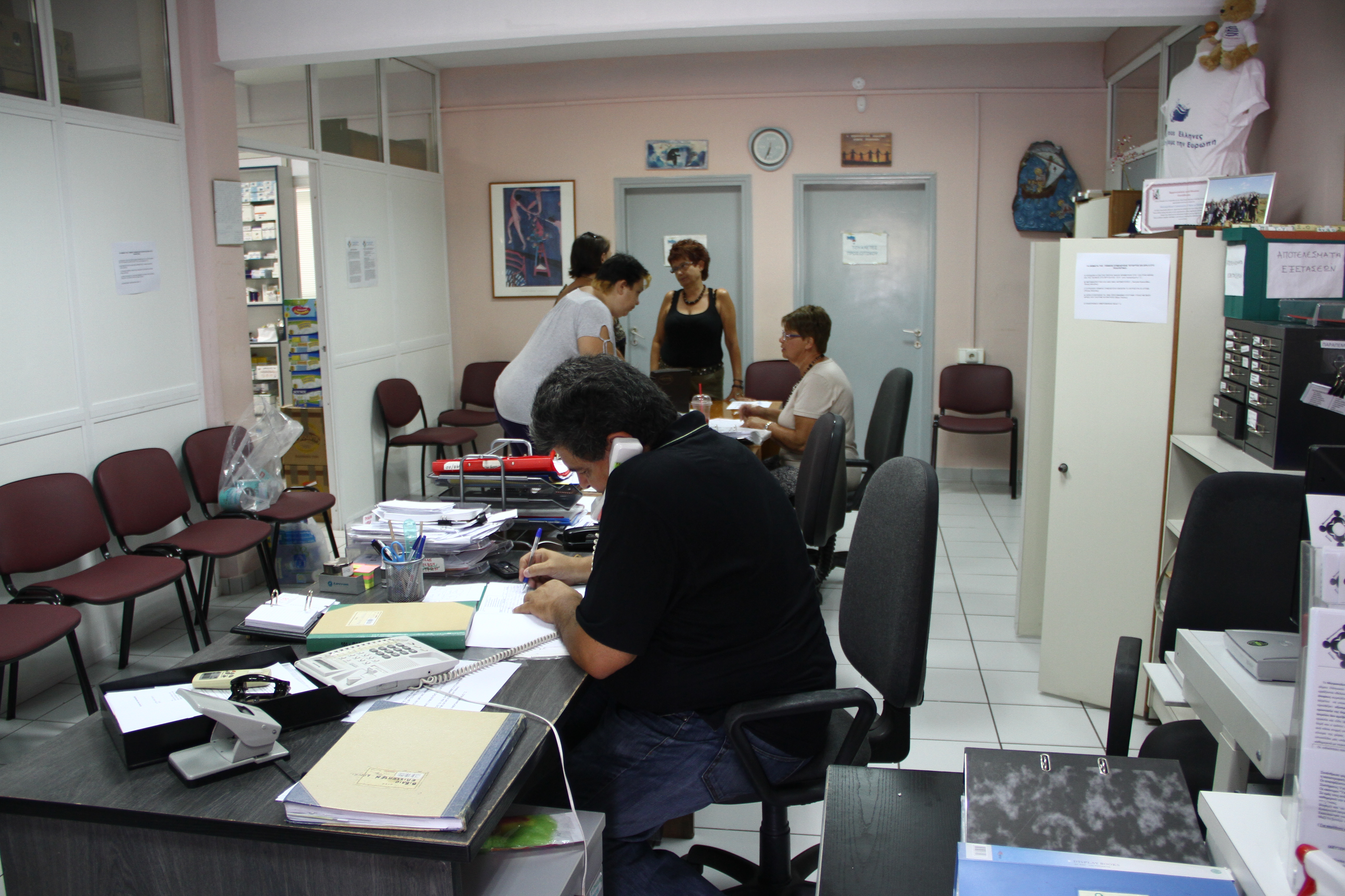Wir fragen nach den Veränderungen, die durch die Krise und die Sparpolitik der Troika hervorgerufen wurden. Christos erklärt uns, dass in Griechenland alle Menschen, die länger als zwei Jahre arbeitslos sind, nicht mehr durch die öffentlichen Krankenversicherung abgesichert sind und damit den Zugang zum öffentlichen Gesundheitsystem verliehren. Das sei auch vor 2009 schon so gewesen, damals aber nicht so gravierend, da die allgemeine Situation der Menschen noch aussreichend gut gewesen sei, dass über soziale Netzwerke oder familiäre Unterstützung im Einzellfall abhilfe geschaffen werden konnte. Zwischen 2009 und 2014 seien die Ausgaben im öffentlichen Gesundheitsbereich um 50% gekürzt worden und mit dem neuen Memorandum von 2014 würden jährlich weitere Kürzungen durchgefürt werden. Durch die Lohnkürzungen bei den Ärzt*innen seien fast 50% der in der Primärversorgung tätigen Ärzt*innen aus dem System ausgestiegen, so dass auch für Menschen mit Versicherung der zeitnahe Zugang zu ärztlicher Versorung fast unmöglich sei. Darüberhinaus müssten die Patient*innen mehr als 25% der Kosten für Arzneimittel selber tragen. Das sei vor allem für Arme, Renter*innen und chronisch kranke Menschen nicht leistbar. Aufgrund dieser Situation behandelt die Klink drei Gruppen von Patient*innen. Zum einen Menschen, die gar keine Versicherung (mehr) haben, dann Menschen, die arm sind, sich also die Zuzahlungen nicht leisten können, und als drittes Menschen ohne Lohnarbeitsverhältnis.
